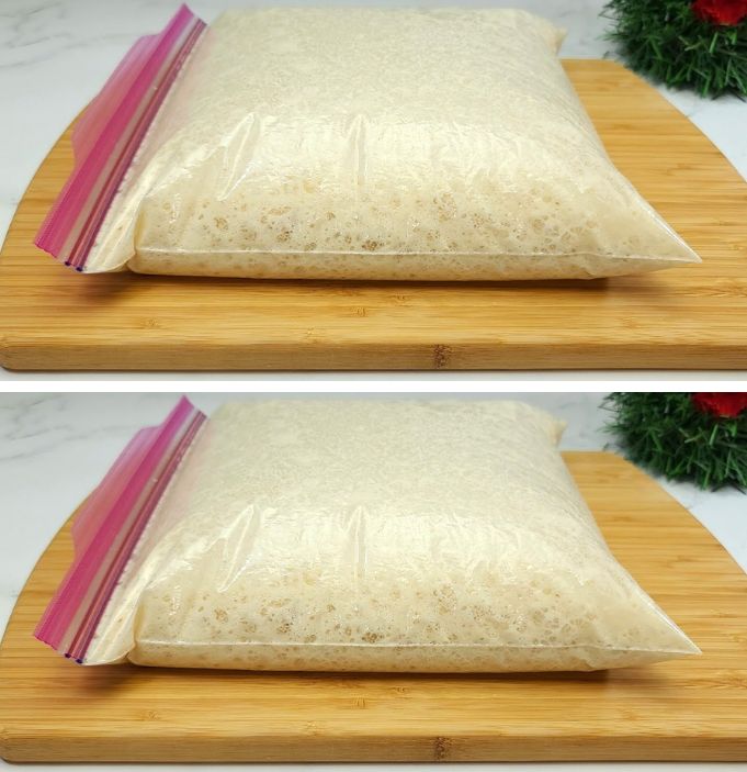 Den Beutel verschließen und den Teig 1 Stunde an einem warmen Ort ruhen lassen.