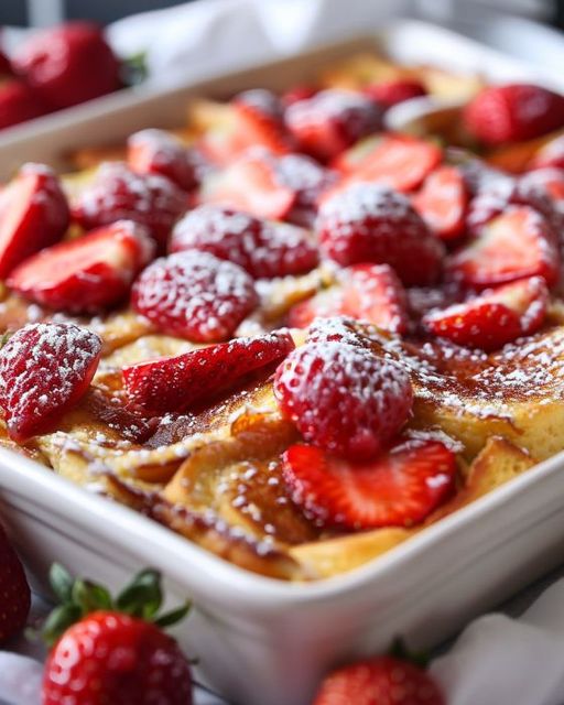 Gebackener Erdbeer-French-Toast ist eine köstliche Variante des traditionellen French Toasts, die die Süße und Lebendigkeit von Erdbeeren in ein wohltuendes Frühstücksgericht einbringt. Die Ursprünge des French Toasts liegen etwas im Dunkeln, es gibt verschiedene Varianten in vielen Kulturen, aber er wird normalerweise mit der Verwendung von altem Brot in Verbindung gebracht, damit in der Küche nichts verschwendet wird. Gebackener Erdbeer-French-Toast erhebt dieses einfache Konzept in ein lebendiges, leicht zuzubereitendes Gericht, das perfekt für einen Familienbrunch oder einen besonderen Morgen ist.
