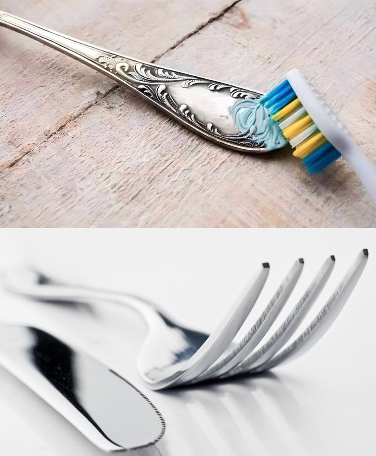 Silberbesteck neigt dazu, Feuchtigkeit anzusammeln, bis die lästige Stahlpatina entstanden ist. Zu den empfohlenen Abhilfemaßnahmen gehört Zahnpasta, wie sie normalerweise zum Zähneputzen verwendet wird.