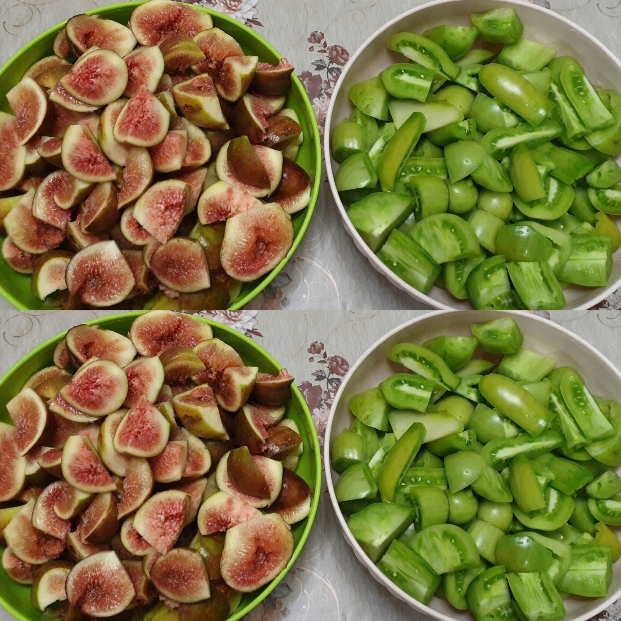 Gehackte Feigen und grüne Tomaten in einen Topf mit dickem Boden geben.