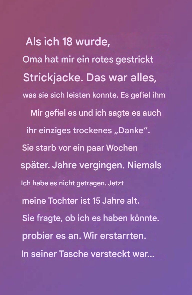 Eine Strickjacke, das ursprüngliche Allzweck-Kleidungsstück, das für den Alltag gedacht war. Ich konnte nicht widerstehen – nicht, weil ich versagt hatte, sondern weil es mich mit Schuldgefühlen erfüllte. Ich ignorierte ihre Bemühungen und behandelte ihr Geschenk wie jeden anderen Pullover. Und dann war sie weg. Jedes Mal, wenn ich meinen Kleiderschrank öffnete, war sie weniger materiell, sondern eher eine stille Erinnerung an die Dankbarkeit, die ich nie wirklich zum Ausdruck brachte.