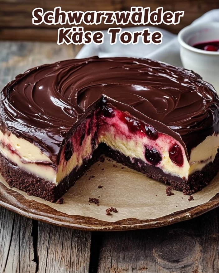 Cremiger Käsekuchen trifft auf die Aromen der Schwarzwälder Kirschtorte – ein unwiderstehliches Geschmackserlebnis!